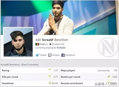 在CS:GO比赛数据统计网站HLTV上队员数据页面我们也可以看到HS%这一项数据。HS是Headshot的缩写,HS%就表示爆头率了,即爆头击杀与总击杀数的比值换算为百分比。我们将最后击杀对手通过射击对手头部完成的击杀称为爆头击杀,爆头率的高低是对瞄准能力的体现,如果一个玩家瞄准能力很强,准星总能锁定对手头部,那么爆头率一定会很高,比如大家钟爱的爆头哥Scream,爆头率有时能达到惊人的80%+。