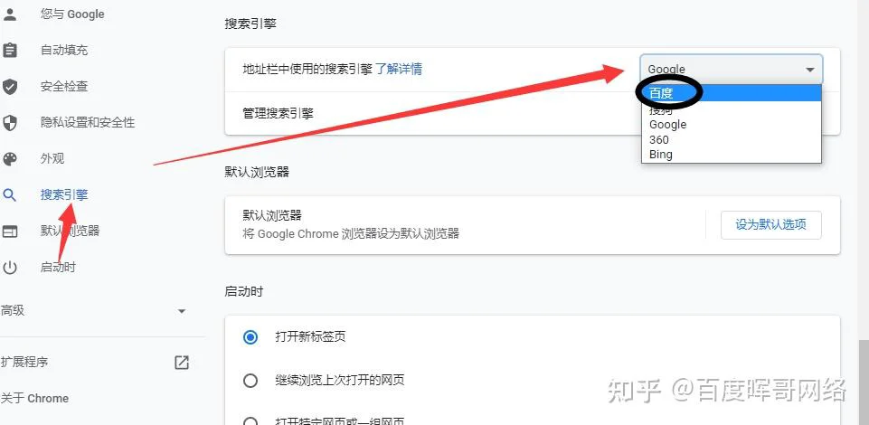 然后在设置选择【搜索引擎】,在【地址栏中使用的搜索引擎】 功能中选择百度