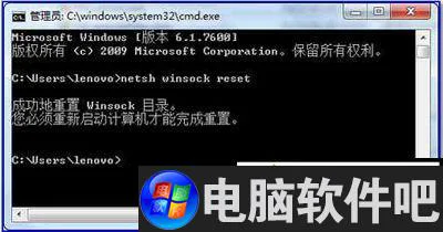 b.在命令提示符处键入 netsh winsock reset,然后按 Enter,重启电脑。
