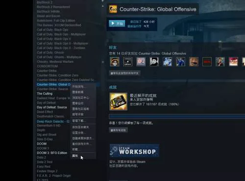 首先右键点击steam库里的的CSGO标题选择“属性”