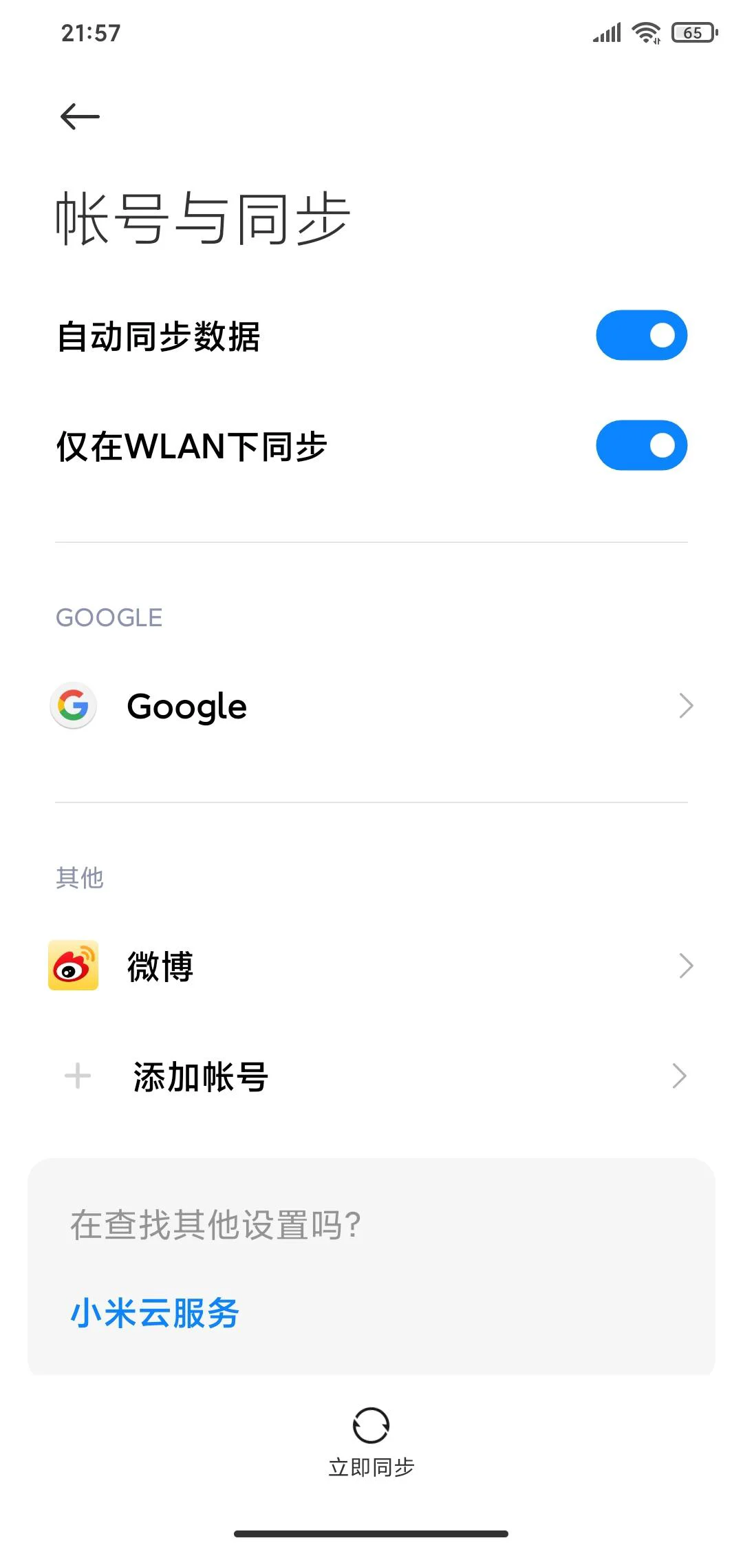 2、打开设置-账号与同步-Google,打开谷歌的同步功能。
