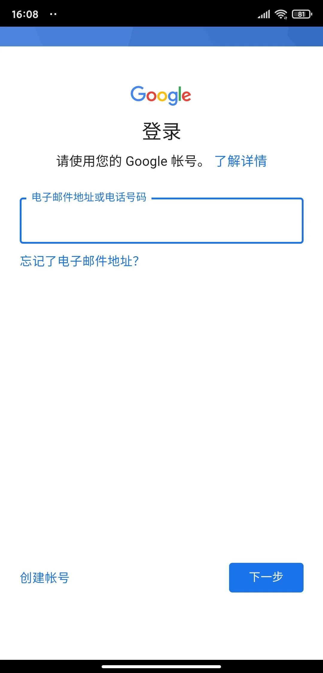 2、上一步完成后,再打开Google Play商店,点击登录,则成功呼出Google账号登录界面。
