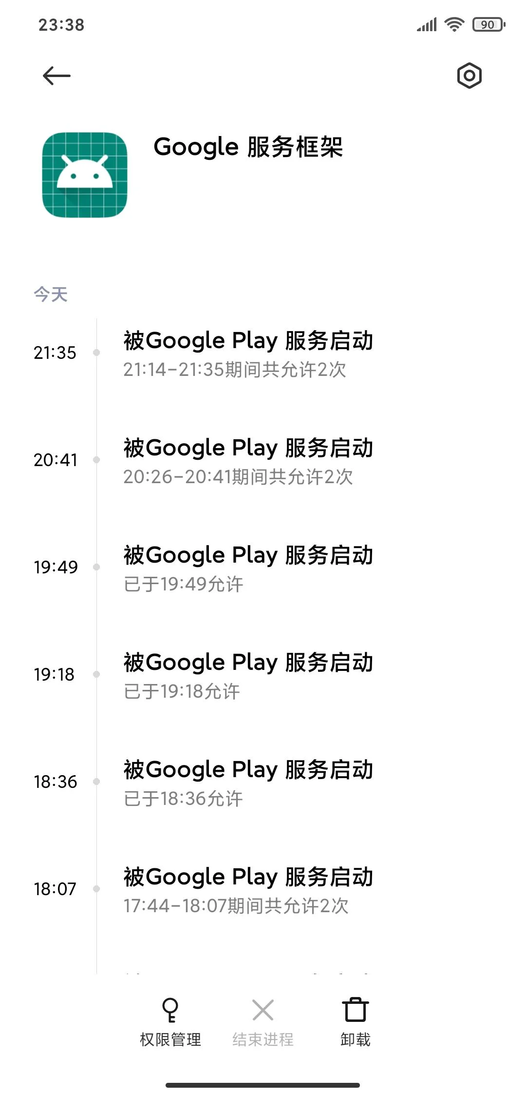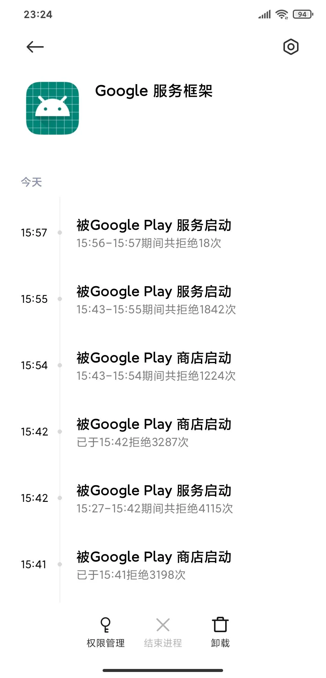 打开应用管家-隐私保护-全部权限使用统计,发现Google Play商店启动Google服务框架这一请求被系统拒绝。因此断定此乃问题所在!