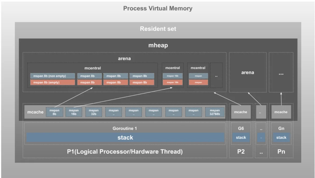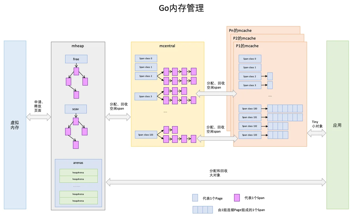 它把从OS申请出的内存页组织成Span,并保存起来。当mcentral的Span不够用时会向mheap申请,mheap的Span不够用时会向OS申请,向OS的内存申请是按页来的,然后把申请来的内存页生成Span组织起来,同样也是需要加锁访问的。大对象(>32KB)直接从mheap上分配。