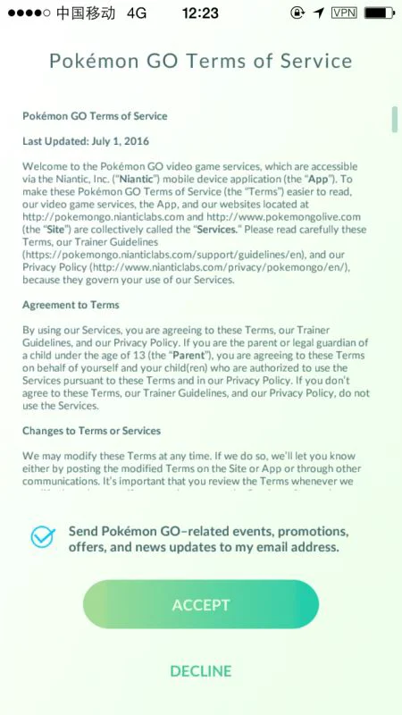 口袋妖怪GO登陆最后一步:点击同意