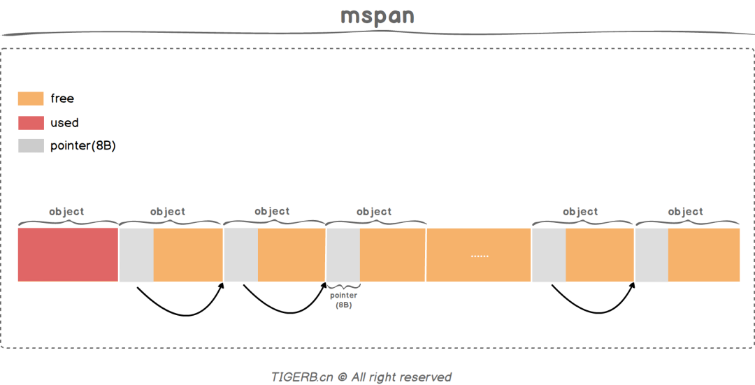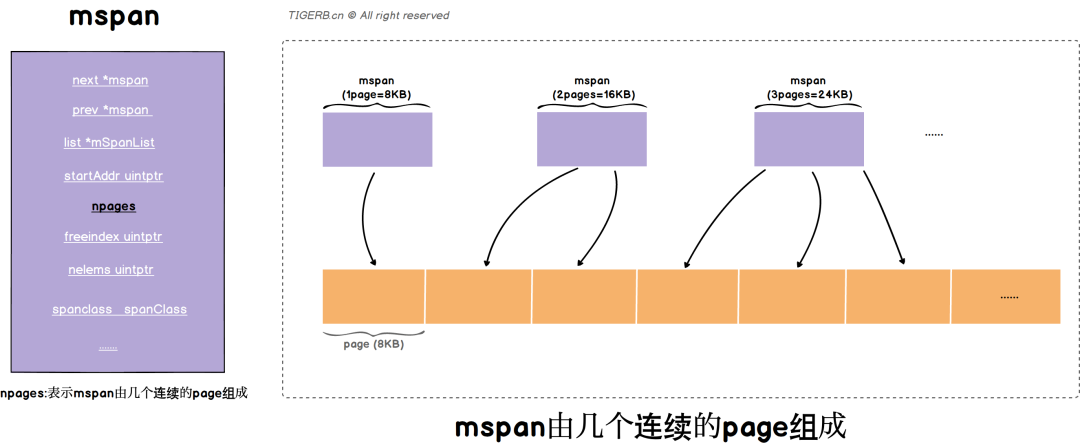 操作系统是按`page`管理内存的,同样Go语言也是也是按page管理内存的,1page为8KB,保证了和操作系统一致。Go内存管理单元`mspan`通常由N个且连续的page组成。相同page数目的`mspan`之间还可以构成mspan链表。