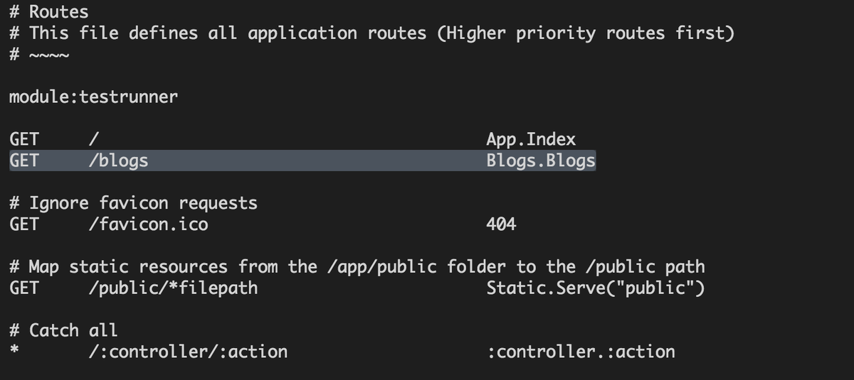现在我们在app/conf/routes这个文件中增加一个路由GET /blogs Blogs.Blogs