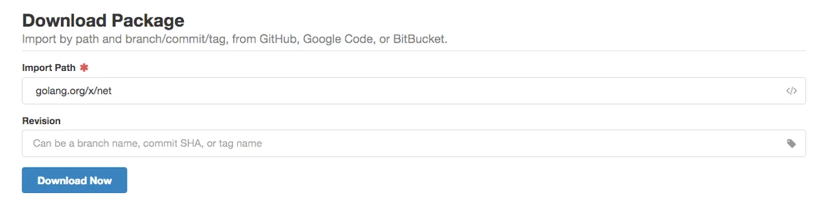 这里就需要知道go的另一个很好的工具:http://gopm.io/。这是一个类似于nodejs的npm一样的工具。他会根据版本号来下载对应的go包,而不是git、hg什么的。你可以下载这个工具,也可以点download项进入下载页面(这里:http://gopm.io/download)。然后在import path里输入 golang.org/x/net,点击下载。这个包就下载下来了。