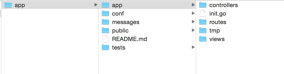 运行revel new命令,revel会为你生成一个默认的站点。命令如下:revel new github.com/first_test/app。应为这个站点只是测试用的,我还要生成更多的其他的站点,所以这里的目录略复杂一点。你可以根据自己的需要决定目录。大体的目录结构式这样的: