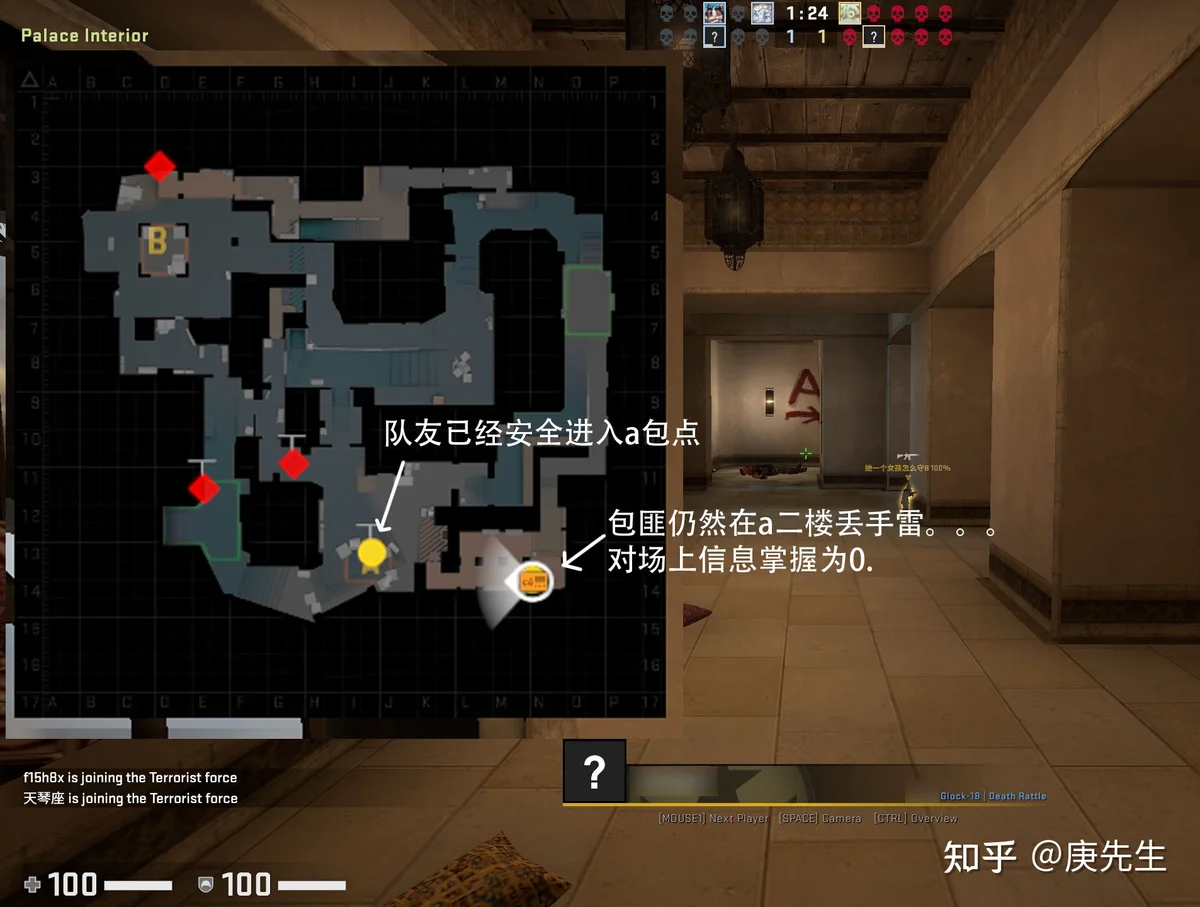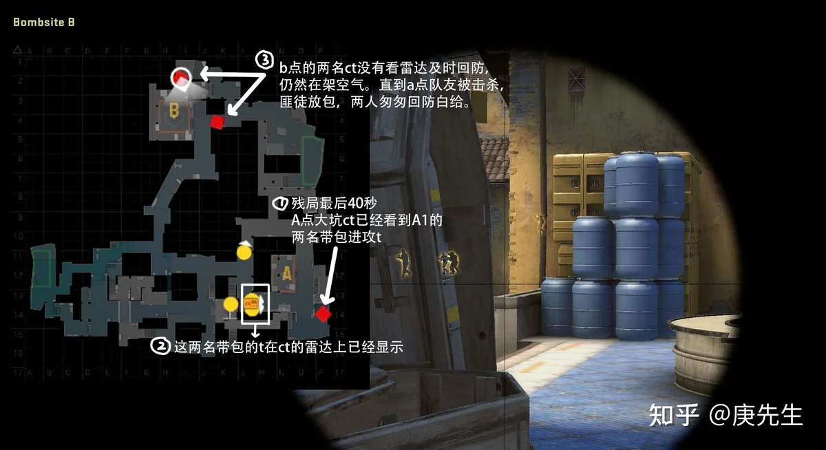 雷达就是你的视觉延伸,队友看到的敌人你就能在雷达上看到。例如我们在t方进入2v2的残局时,你的队友率先在a点看到了两名ct并交火牺牲,由于休闲模式死人不能报点,你看一眼雷达得知两名ct都在a,就不用在中路、侧道或者香蕉道像个憨憨一样静摸了,直接提刀去b放包,求一个打赢残局的最优解。作为ct也可以通过雷达读取出对手的进攻动态,及时回防,如下图:a点大坑的队友已经发现了两名T带包到了a1,此时雷达已经显示,b点的两名ct根据这个信息及时回防才可能打赢这个残局,可惜他们还在b点架空气。