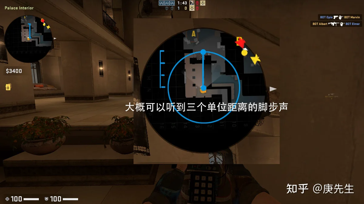 那么csgo里的声音可以听多远呢。这个有个体差异,以我个人举例,在csgo休闲局仅有的两张地图中,以荒漠迷城为例,大概可以听到三个单位距离的脚步声: