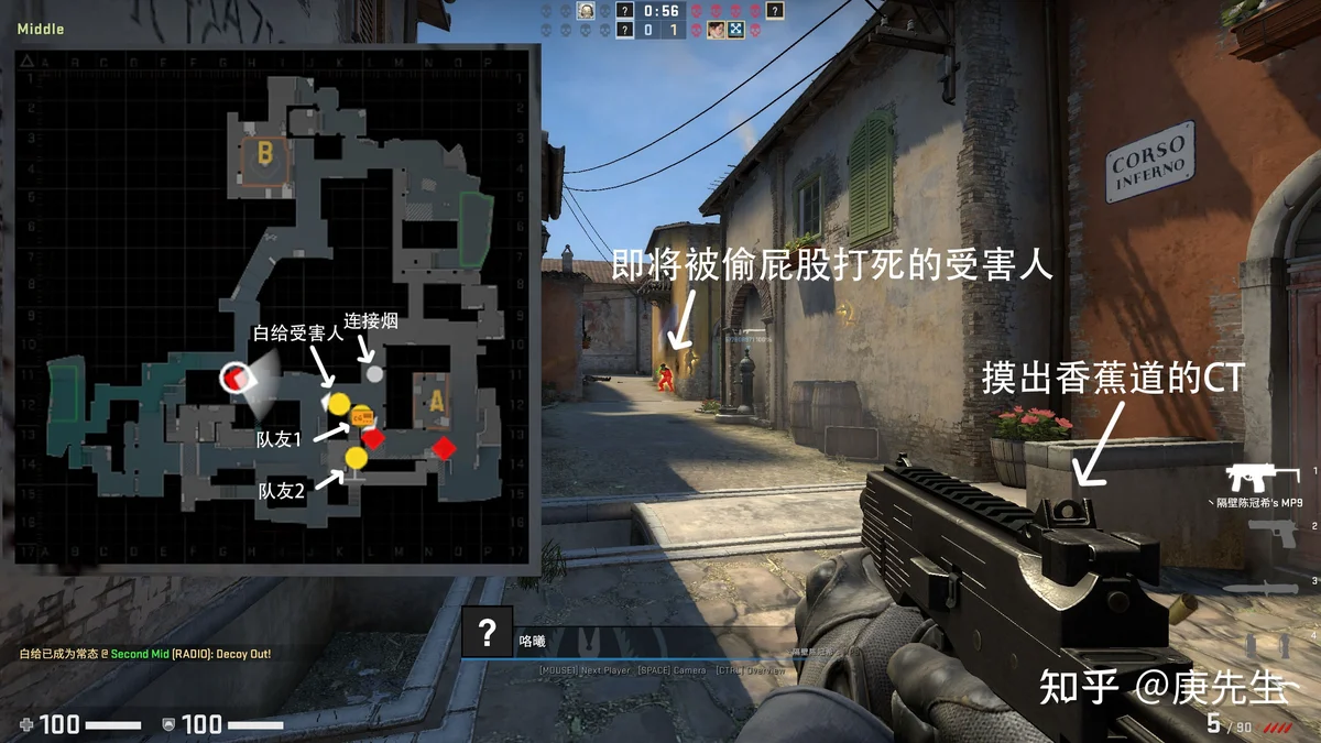 再比如开局快一分钟了,我们作为t还没有攻入a点,一堆人在a2楼和警中外晃悠,看一眼雷达发现香蕉道没有队友,(或者仅有一个在匪口里面架枪的队友)这时候我们就要有意识的小心香蕉道的ct压出来,去反架一下香蕉道杀掉正在前摸的ct,招呼队友转身打b你就是功臣。