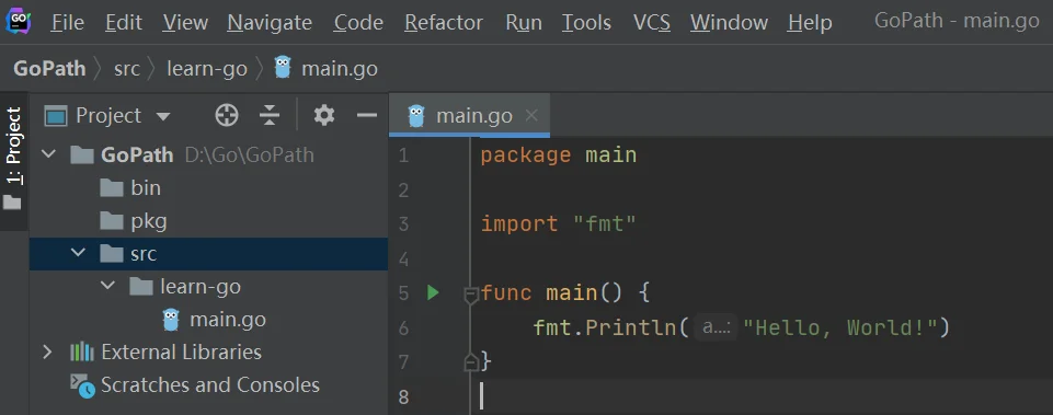 3 运行项目使用 GoLand 新建一个项目 learn-go,默认位于 GoPath/src 下。在 learn-go 文件夹下新建文件 main.go 文件,内容为: