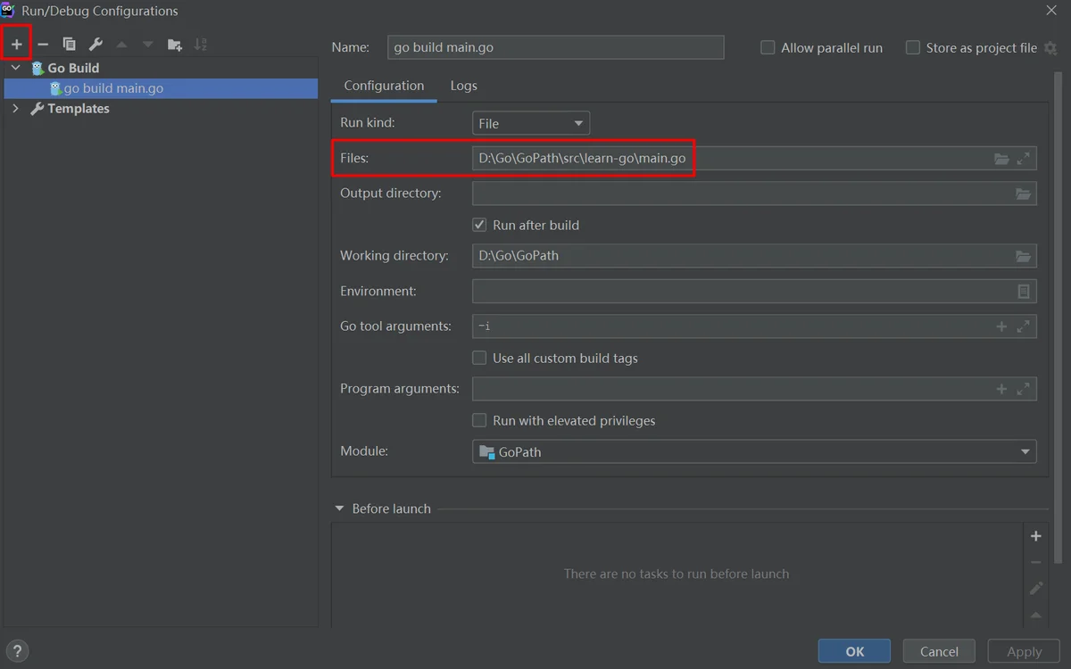点击右上角的“Add Configuration”,在弹出的页面点击左上角的加号,添加 Configuration。Files 选择新建的main.go。